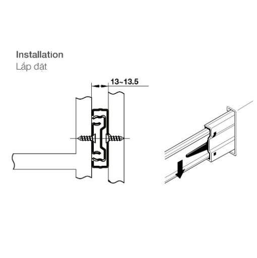 - Lắp đặt: Dùng vít bắt dọc hai bên sườn, hệ thống lỗ chờ theo tiêu chuẩn 32mm